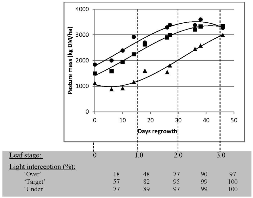A single example of the regrowth of perennial ryegrass pasture following defoliation to three levels: 1150 kg·DM/ha (triangles, representing “over-grazing”), 1500 kg·DM/ha (squares, representing the “target” for residual state) or 1850 kg·DM/ha (circles, representing “under-grazing”) kg·DM/ha. Regrowth commenced on 28 March. Timing of the full emergence of the first, second and third new leaves after defoliation, and light interception, are shown below the x-axis.