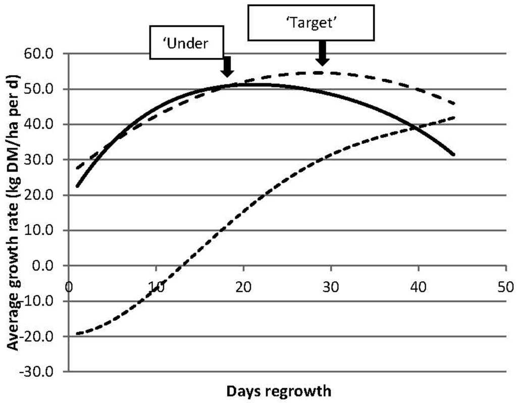 Importantly, the growth rate achieved at the point of maximum average growth rate is higher for the “target” treatment (about 55 kg·DM/ha per day on the vertical axis in Figure 2) than for the “under” treatment (about 51 kg·DM/ha/day; see also Figure 3.10 in [14]) although the difference is small. The total net amount of pasture grown at the point when maximum average growth rate was reached in the “target” and “under” treatments was 2110 and 1260 kg·DM/ha respectively, or an average of around 70 kg·DM/ha per day in both treatments. As noted above, maximum average growth rate was not attained in the “over” treatment: the highest growth rate reached was just over 40 kg·DM/ha per day, and after 45 days regrowth (the three leaf stage) pastures in this treatment had accumulated 2370 kg·DM/ha at a mean growth rate of 52 g·DM/ha per day. The “over” treatment can never catch up with the “target” treatment because of the lag in regrowth that occurred after defoliation (Figure 1). This is fundamentally a problem caused by over-grazing (residual pasture mass/leaf area is too low). There is an important interaction here between the residual pasture state post-grazing and the length of the regrowth period; both of which can be controlled by grazing management decisions.