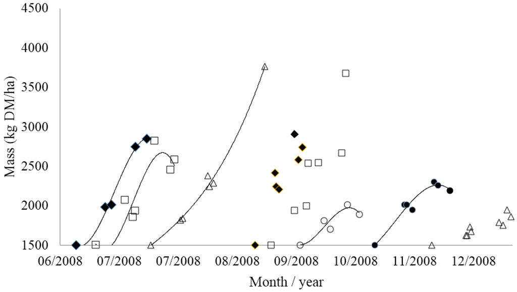 The analysis above shows that, as well as tracking the accumulation of herbage mass during regrowth, the sigmoidal growth curve holds additional information that is valuable for improving the efficiency of grazing management. However, this information has seldom been used explicitly to test and further develop grazing recommendations. In part, this is due to the difficulty of accurately measuring the accumulation of mass during regrowth, given the temporal variation in growth conditions that typically occurs over periods of 3–6 weeks, the spatial heterogeneity in herbage mass that is ubiquitous in pastures (especially when grazed), and the relatively low precision of techniques for measuring pasture mass. Nonetheless, examples of sigmoidal regrowth curves can be found in the literature (e.g., [33,34,35]).