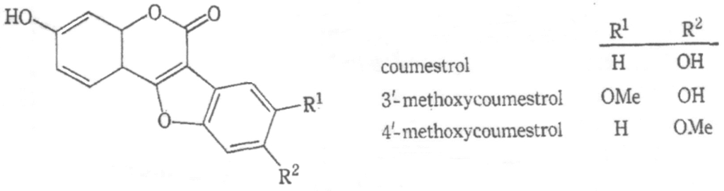 - Coumestans: At least 27 coumestans have been described [17,18], many of which have two or three synonyms. Coumestrol [syn 7’12’ dihydroxy coumestan] has been found in 58 plants [2], especially legumes, (e.g., lucerne), other perennial Medicago (e.g., M. falcata), annual ‘medics’ (Medicago spp.), peas (Pisum sativum), soybean, limabeans (Phaseolus lunatus), pinto beans (P. vulgaris), and some clovers (e.g., white clover [5,19,20] and strawberry clover (T. fragiferum) [6]). The relative abundance of particular coumestans and flavones that white clover produces in the field varies considerably depending on which plant pathogen stimulates their production [21,22]. The coumestrol content in white clover was considered insufficient to explain the oestrogenic activity it was responsible for [5,20]; other phytoestrogens may be involved. Although it is the most commonly measured coumestan, coumestrol’s concentration is likely to underestimate the oestrogenicity of the plant. Other coumestans include 4’-methoxy-coumestrol, 3’-methoxycoumestrol [syn 7,12-dihydroxy-11-methoxycoumestan], 11,12 dimethoxy-7-hydroxy coumestan, coumestrol dimethyl ether [syn 7’12’ dimethoxy coumestans], aureol, lucernol, medicagol, repensol, sativol, trifoliol, wairol, wedelactone [syn 7-methoxy-5,11,12-trihydroxy-coumestan], and wedelolactone [17,18].