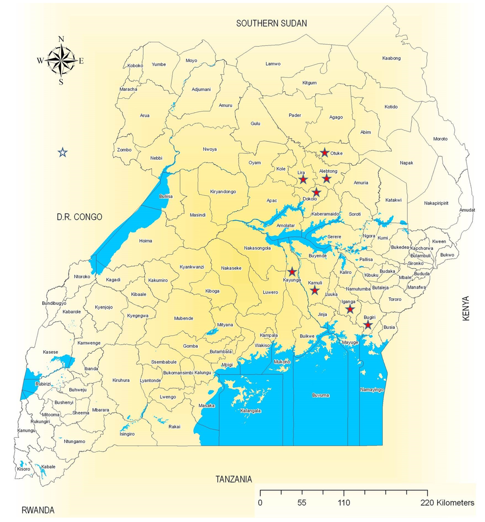 The survey was conducted in the north, east and central regions of Uganda. Four districts were selected from the north, i.e., Lira, Dokolo, Otuke and Alebtong; three districts from the east, i.e., Iganga, Bugiri and Kamuli; and one district from the central area, i.e., Kayunga (Figure 1).