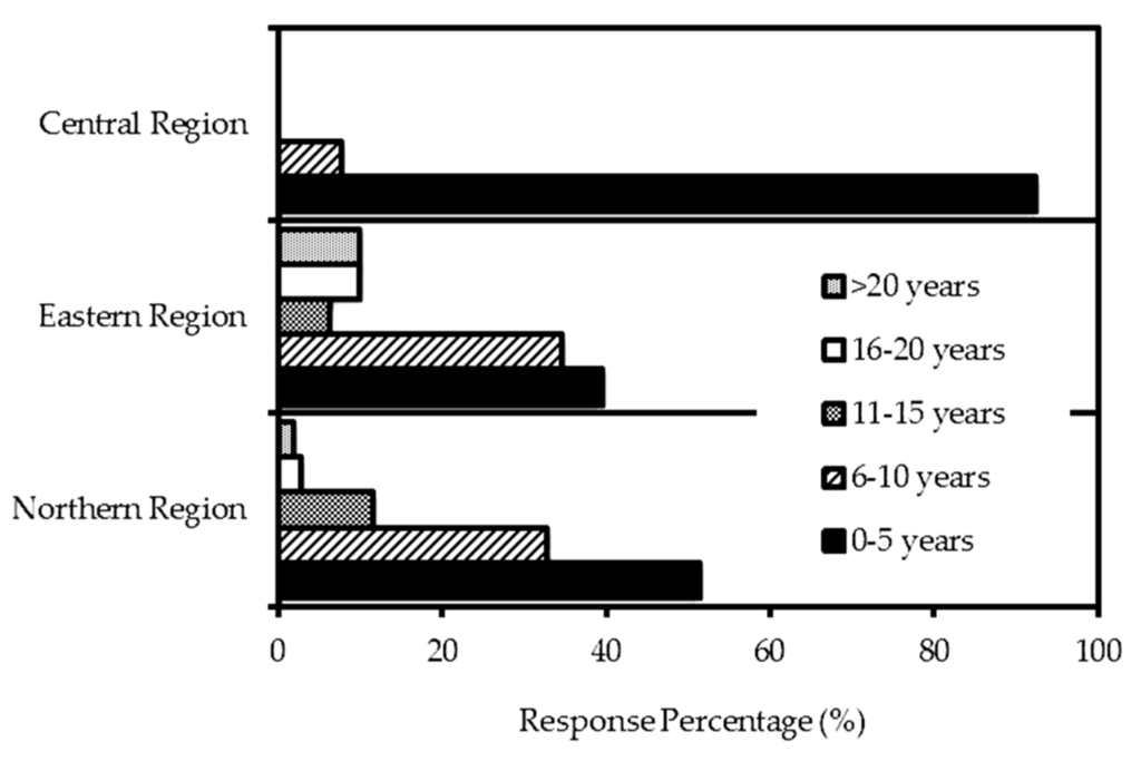 Years of experience of the respondents in rice farming. The total number of respondents for the northern, eastern and central regions was 113, 81 and 26, respectively.