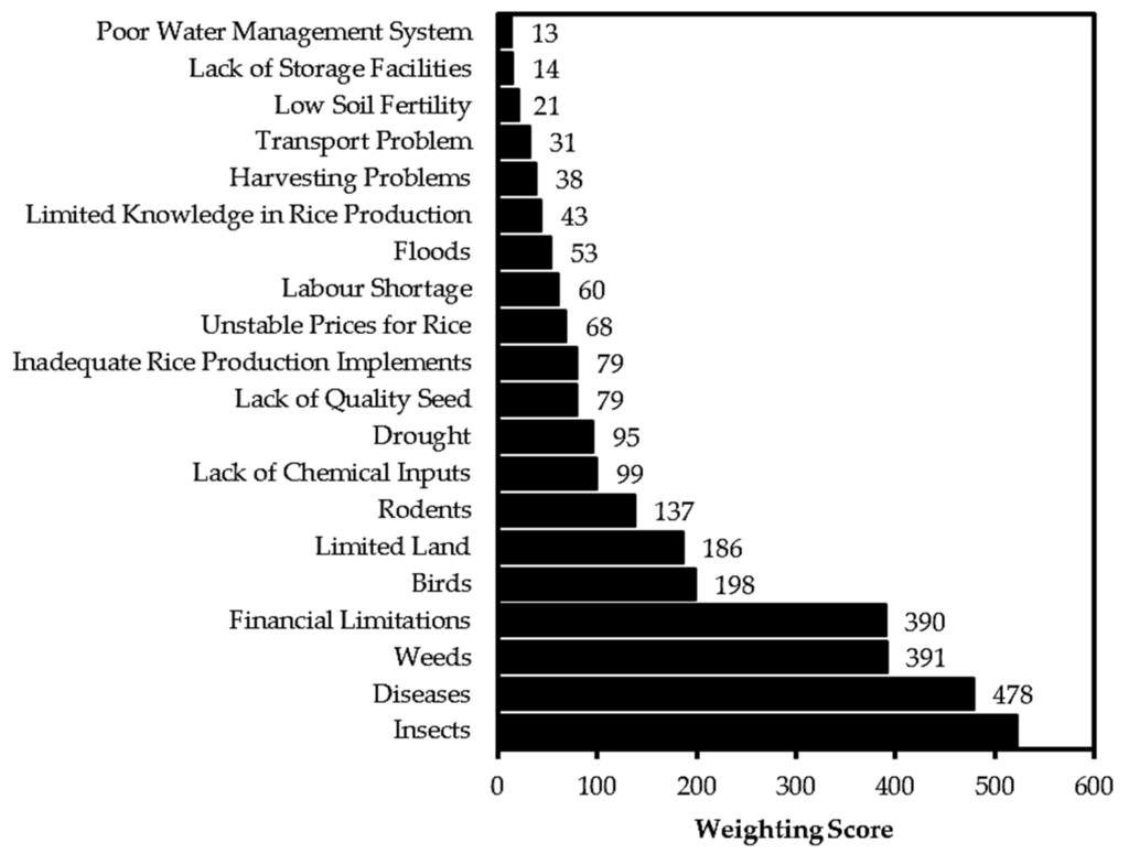 The five most important constraints in rice production were insect pests, diseases, weeds, financial constraints and birds, as shown in Figure 3. Financial limitations were related to production costs such as tractor hire and hire of labor for various production operations performed, especially when family labor is inadequate.