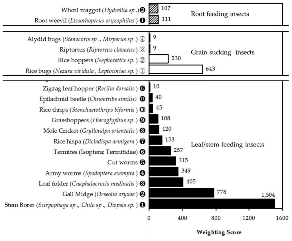 Rice insect pests were broadly categorized into three groups, namely, leaf/stem feeding insects, grain sucking insects and root feeding insects. Generally the leaf/stem feeding insects or defoliators seemed to dominate over other categories—going by the high average weighting score (340). Grain sucking insects came second in importance with an average weighting score of 223, while root sucking insects were considered the least important insect-pest problem scoring only 109. The most important leaf/stem feeding insect-pests according to the farmers were the stem borer, African rice gall midge (AfRGM) and leaf folders. Rice bugs were considered the most significant pest among the grain sucking insects while root feeding insects such as the root weevil and whorl maggot were perceived as minor pests.