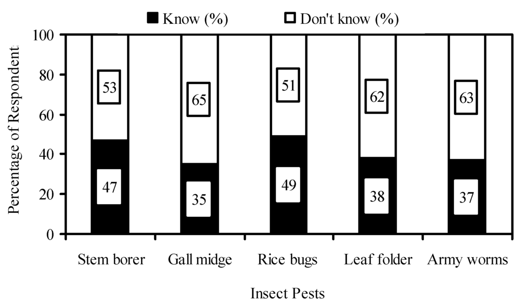 Proportion of farmer respondents who could correctly identify either the major insect pests of rice or their symptoms.