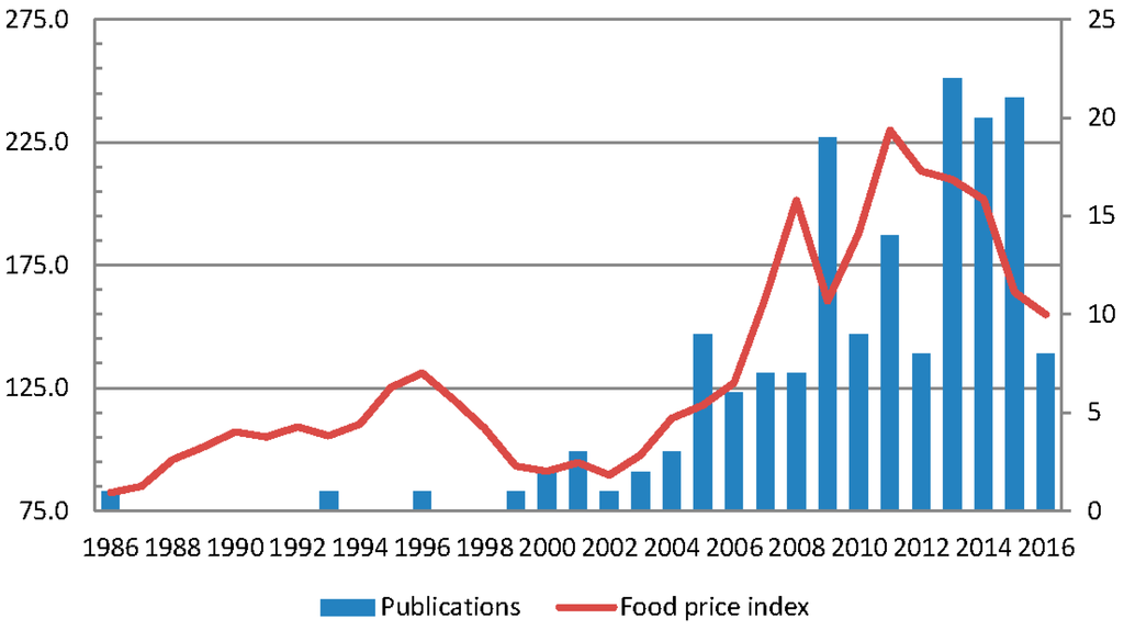 The figure clearly shows that a peak in publications from year 2005 occurs with a fifteen—eighteen months delay after the price shock. The second peak of publications, in 2013, could be due to the increased attention of researchers and funding sources to the analysis of food systems shocks using ACSM. Additionally, if we account for the delay from the submission of a manuscript to its acceptance and publication in peer-reviewed journals (thus accounting for the time needed by the reviewing process) we could justify the publications spikes in 2009, 2013 and 2015.