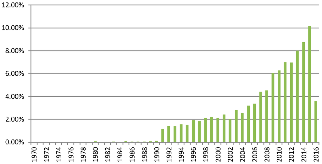 Instead, Figure 3 shows the number of publications over time in AM and Figure 4 their percentage share. It appears as a consolidated research area where traditional tools of econometric and statistical analysis find space for publication. Indeed, the graph shows a typical exponential growth of publications over time. Similar to ACSM, the rate of publications increased after the 2007–2008 food prices spike and continued even after.