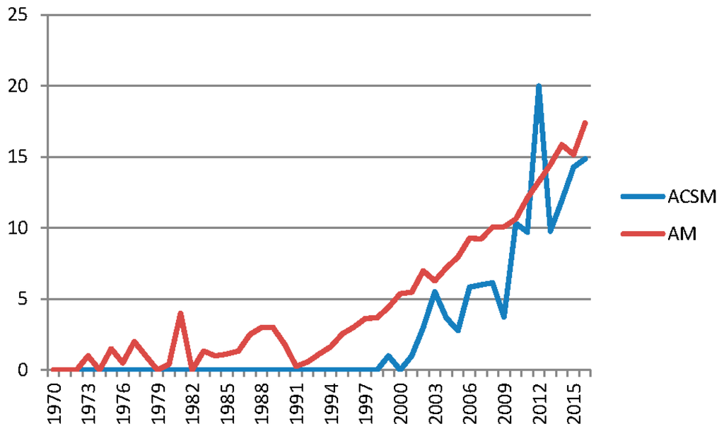 Then, we compare the average number of citations per paper in both ACSM and AM (Figure 7). AM follows a stable trend of growth of average citations per paper over time as a difference from ACSM. In particular, Figure 7 shows that ACSM overcame AM in the year 2012 and, even if irregularly, ACSM shows a faster exponential growth than AM.