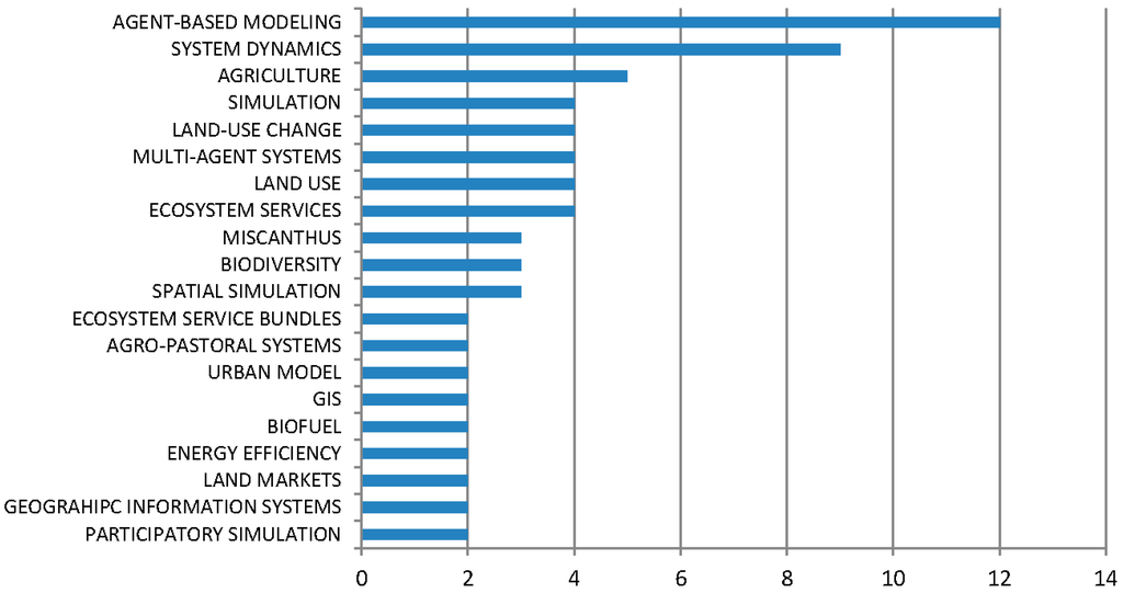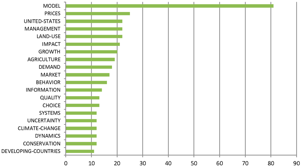 Finally, we looked at the keywords selected for the most frequently cited works, and results are shown in Figure 8 and Figure 9. We downloaded the keywords from the ISIWeb of Science database filtering by the only paper with a certain number of citations (40 for AM and 5 for ACSM) to assure consistency in the importance of the keyword datasets. The word model, and or modelling method (SD or ABM) are the most used keyword in both fields. More interesting, in the case of ACSM, it emerges the relevance of keywords that focus on land, agriculture, and ecosystems, whereas in AM keywords from economics (such as prices, growth) prevail. The presence of the keyword United States at third position explains the geographic focus of journals and authors by sector.