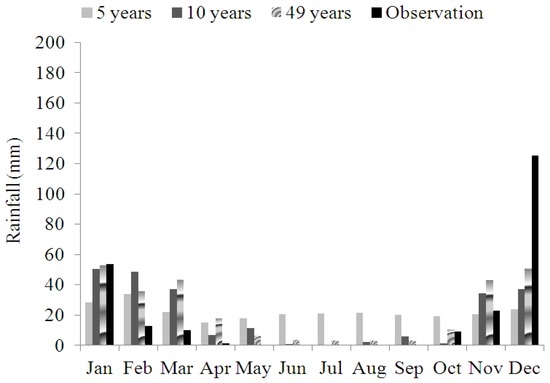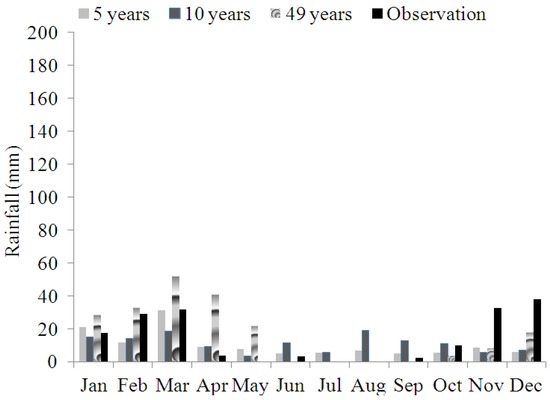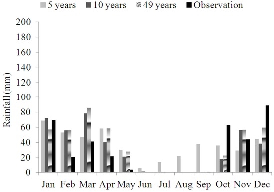In the Mashhad station, data from 5 years prior was sufficient for forecasting, and this is a good result for deficit data situations. However, according to Table 2 and Figure 4 and Figure 5, with 60 observation data, the accuracy of forecasted rainfall was not ideal.