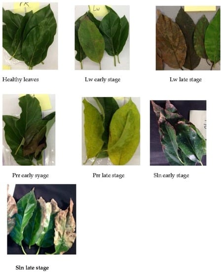 Avocado leaves in different stress stages: healthy, laurel wilt (Lw), Phytophthora root rot (Prr), and Salinity (Sln).
