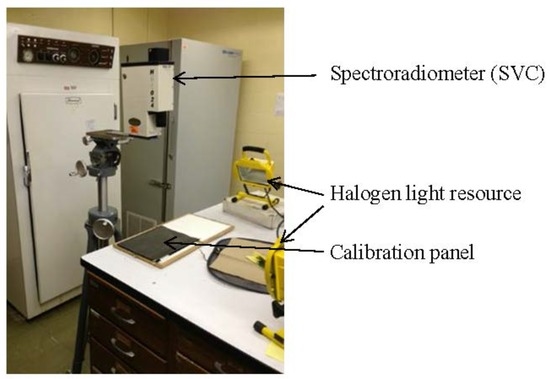 Forty leaves were sampled from each of the control and treated plants. Multiscans were taken at different positions in order to reduce the variability of the spectral device and the leaves. Five reflectance spectra per each leaf were collected at two stages of symptom development: early and late, depending on the symptomatic appearance. A handheld spectroradiometer (SVC HR-1024i™) (Spectra Vista Cooperation, Poughkeepsie, NY, USA) with a 4° field-of-view optical lens and a spectral range of 350 to 2500 nm was used. Two portable halogen work lamps (500 W) were used as the light source, and the reference reflectance spectra were acquired using a white reflectance reference panel (Spectralon Reflectance Target, CSTM-STR-99-100; Spectra Vista Cooperation) [1] (Figure 2). Spectral data were selected in the visible and near infrared domain from 350 to 950 nm. Spectral data were averaged for both stages to 10 nm and 40 nm based on previous studies [36,37]. The purpose of averaging data to 10 and 40 nm is to reduce the numerous wavelengths and also reduce noise and interference between wavebands. Additionally, waveband filters for 10 and 40 nm are available in the market and are reasonably priced for future sensor development. Therefore, the number of wavelengths for 456 nm was dropped to 49 and 15 wavelengths for 10 and 40 nm, respectively. Sample size for spectral reflectance data were applied between 196–200 for each category.