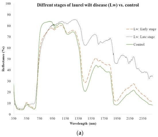 The secretion of redbay ambrosia beetle saliva helps to spread R. lauricola from tree to tree [12]. In addition, R. lauricola grows rapidly inside the wooden stems [5,13]. The fungi reduce the tree’s ability to transfer nutrients and water to the branches and leaves. Generally, the disease causes several changes to the plant, such as the change in color of the leaves from green to a red-purple brown, the underside of the bark becomes black, and small pores and holes form inside the outermost layer of bark [14]. All of these symptoms may indicate the presence of the redbay ambrosia beetle in the tree [9,14]. Many of the disease symptoms are similar to those caused by other diseases such as Phytophthora root rot (Phytophthora cinnamomi) or factors such as lightning damage, freeze damage, or drought stress [15], making visual detection of Lw difficult. Moreover, the development of external symptoms signifies colonization of the host [16]. It may not be possible to manage the disease once plants display external symptoms [17]. Therefore, an advanced and rapid method for detecting Lw that can distinguish these biotic and abiotic stresses is needed [18]. Currently, the only method to reduce the effect of Lw is by complete removal of the infected tree, including the root, so that vectors cannot transfer the disease to healthy trees [2,10,15]. Lw disease has spread very quickly in just a few years through Florida and other states [16], so it is necessary to find a rapid method to detect the disease in a timely manner to at least reduce the spread of the redbay ambrosia beetle. There are several methods that can detect the disease, such as scouting and polymerase chain reaction (PCR) [19], but they are costly and time consuming; therefore, it would be helpful to develop a faster and more rapid method of detecting Lw disease [20]. Spectral reflectance is a method that is considered to be rapid and non-destructive [21]. Spectral reflectance methods depend on reflected or emitted radiation from different bodies, so each material has a different spectral signature [22,23]. For plant signatures, the spectral reflectance either increases or decreases depending on physical (external) factors such as chlorophyll and pigment concentration which are used as indicators of the plant condition in the visible range (450–760 nm) [24,25,26]. There are also other factors such as physiological structure, condition of the cell wall, water content, surface roughness, and stoma activity which will affect light penetration through the leaf structure, so the spectral signature in the near infrared (NIR) range of 760 to 2500 nm is used to indicate these factors [27,28].