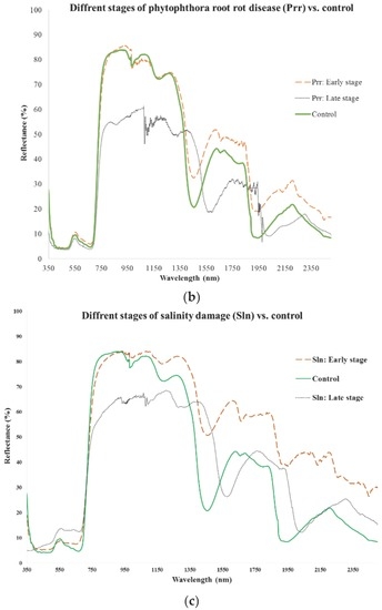 It is possible to use Visible-Near Infrared (V-NIR) techniques to distinguish healthy from unhealthy leaves [26,29,30,31]. Ma et al. [32] used a visible remote sensor with different multi-spectral wavelengths to detect citrus greening. Some studies confirmed that spectrometric methods are more effective, more accurate, less time-consuming, and nondestructive compared to DNA analysis methods [33,34]. Frank and Menz [35] utilized spectral data at different wavelengths to monitor the powdery mildew disease of leaf rust at different stages of development. Fungicide treatment was then applied using precision agriculture to determine the interaction of the crop with the fungicide. Results were compared with chemical analysis and showed an increase in early disease detection from 56% to 88.6%, which was considered an acceptable result for early disease detection. The goals of the present study were to: (i) determine the hyperspectral mean reflectance curves of Lw infested trees at different stages of development; (ii) select the optimal spectral bands for discrimination of damage due to Lw, Phytophthora root rot, and salinity.