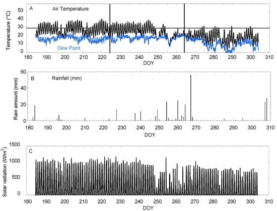 Air temperature, dewpoint temperature, rain, and radiation over the course of the study are shown in Figure 1. The weather for 2014 was typical for the location. The decline in air temperatures after DOY 250 (7 September) indicates the beginning of the season’s end and such abrupt end-of-season temperature transitions are not unusual. Dew point temperatures varied diurnally and seasonally over the study period. Solar radiation over the season was typical with a gradual decline over the study period.