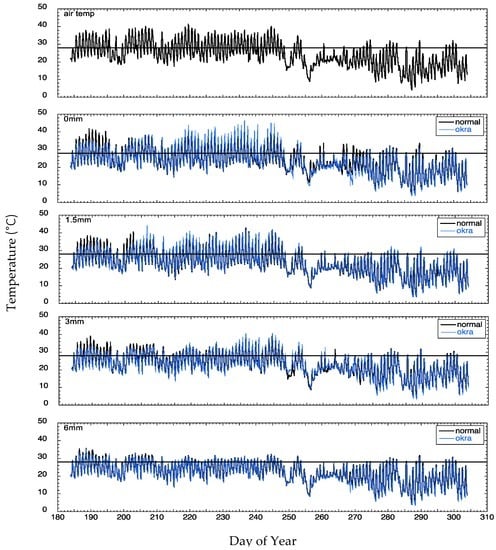 The normal leaf and okra leaf canopy temperature pairs at each point in time were compared using a paired t-test. The results of these comparisons are shown in Table 2 with significant differences (p < 0.001), denoted with ***. With the exception of four instances in the 0 mm treatment and one instance in the 1.5 mm, the canopy temperatures were significantly different between the okra and normal leaf types. The differences are generally quite small and close to the resolution of the IRTs and, thus, their importance could be questioned from an agronomic perspective.