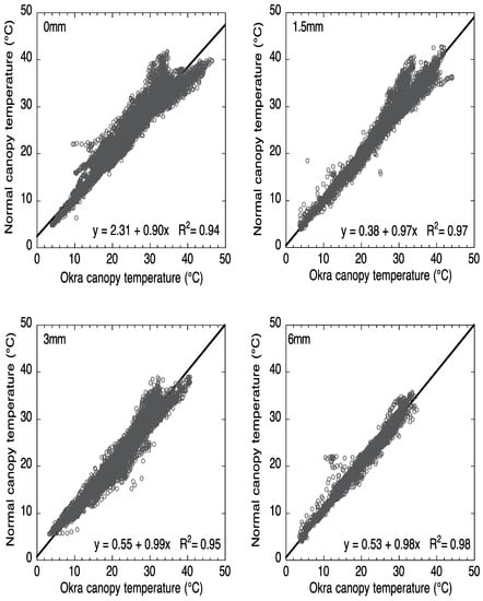 Figure 3 compares the canopy temperature of the normal and okra leaf over the 120-day Full-season period. As the irrigation level increased the canopy temperatures of the two varieties became more similar. In the 1.5 mm, 3 mm, and 6 mm irrigation treatments the y-intercepts are <0.55 °C which is near the resolution limit of the IRTs, while it is higher, at 2.3 °C, in the 0 mm condition. The R2 value is lowest for the 0 mm (0.94) and >0.95 for the 1.5 mm, 3 mm, and 6 mm treatments. Thus, for the entire study period there are differences in canopy temperature between the varieties but they are generally small.