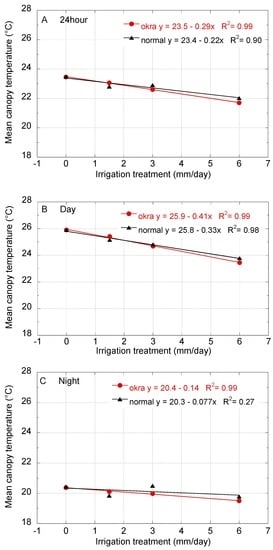 Comparison of mean canopy temperature of the okra and normal leaf varieties over the 120-day study period at four irrigation levels. Three periods of the day are shown; (A) 24 h, (B) day, and (C) night.
