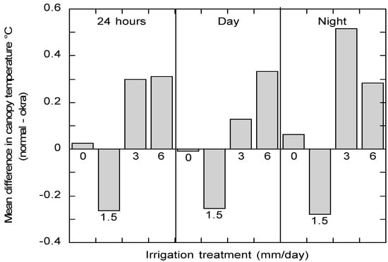 Mean difference in canopy temperature for okra and normal leaf varieties (normal–okra) as a function of irrigation treatment over the 120-day study period. Three periods of the day are shown; 24 h, day, and night.