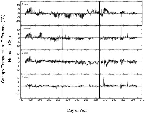 Difference in canopy temperature (15 min interval) for okra and normal leaf varieties (normal–okra) as a function of time (DOY) over 120-day study period for four irrigation treatments. Positive values indicate that normal leaves are warmer than okra leaves and negative values indicate okra leaves are warmer than normal leaves.