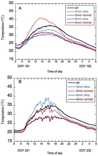 Since the multi-day means reduce the variation apparent in seasonal differences, it might be instructive to look at the time series of canopy temperature data. While the effect of irrigation on canopy temperature is apparent, not all days of the season look the same (see Figure 6). Figure 7 shows the pattern of air and canopy temperature for two 24-h periods (DOY 191 and DOY 231) of the study period that were chosen to demonstrate some characteristics of canopy temperature in the two varieties at two water levels. Figure 7A shows the patterns of air and canopy temperature for DOY 191. At 6 a.m. the temperatures of the varieties are quite similar, the water effect is minimal and canopy temperatures are below air temperature. As radiation increases over time, both air and canopy temperatures increase. The canopy temperatures of both varieties in the 6 mm irrigation treatment are similar throughout the period. In the 0 mm treatment, the temperatures of the varieties begin to diverge by 8 a.m., with the normal leaf variety becoming warmer than the okra leaf and remaining higher until approximately 8 p.m. The temperature of the normal leaf variety remains lower than the okra over the 8 a.m. to 8 p.m. period. After 8 p.m. the temperatures of the varieties remain similar and below air temperature for the remainder of the 24-h period. On this day canopy temperatures for both varieties in the 6 mm treatment and the normal leaf in the 0 mm treatment remained below the air temperature over the period. Under such conditions, transpirational cooling largely influences the canopy temperatures, and leaf shape-related differences would be minimal. During DOY 191, any effect of leaf shape on canopy temperature would probably be relevant only for the normal leaf in the 0 mm treatment. Figure 7B shows air and canopy temperatures for DOY 231. At 6 a.m. the temperatures of the varieties are quite similar and the water effect is minimal. Canopy temperatures are below the air temperatures. As radiation increases over time, both air and canopy temperatures increase. In the 6 mm irrigation treatment, the temperatures of the varieties increase and remain very similar. In the 0 mm treatment, the temperatures of the varieties begin to diverge by 8 a.m., with the okra leaf variety becoming warmer than the normal leaf and remaining higher until approximately 8 p.m. The temperature of the normal leaf variety remains lower than the okra over the 8 a.m. to 8 p.m. period. After 8 p.m. the temperatures of the varieties remain similar and below the air temperature for the remainder of the 24-h period. On this day canopy temperatures for both varieties in the 6 mm treatment and the normal leaf in the 0 mm treatment remained below the air temperature over the period. Under such conditions, transpirational cooling largely influences canopy temperatures and leaf shape-related differences would be minimal. During DOY 231, any effect of leaf shape on canopy temperature would probably be relevant only for the okra leaf in the 0 mm treatment.