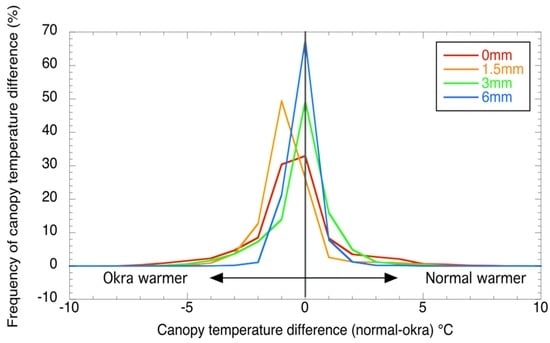 Since the difference in canopy temperature between the two leaf shapes is variable over the season, the distribution of those differences over time might be instructive. Figure 8 shows the distribution of the difference between normal and okra leaf canopy temperatures over the study period. The distributions for the 3 mm and 6 mm treatments are symmetrical with a peak at 0 °C though the 3 mm distribution is slightly broader. The peak in the 1.5 mm distribution is at −1 °C indicating a shift toward the okra leaf being warmer. The distribution of the 0 mm is broader and generally shifted toward okra leaf being warmer. These data indicate that at high irrigation the differences between the okra and normal leaf varieties small and random while, at the lower irrigation levels, the differences are larger and skewed toward the okra leaf being slightly warmer than the normal leaf. These results suggest that the okra leaf canopy temperatures are not lower than the normal leaf temperatures based on the possibility of enhanced sensible energy exchanges associated with the okra leaf shape, particularly in the lower irrigation regimes.