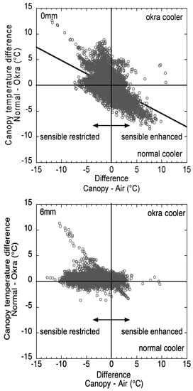 Difference in canopy temperature for okra and normal leaf varieties (normal–okra) as a function of the difference between the canopy temperature of the okra leaf variety and air temperature (okra leaf–air) for the 0 mm and 6 mm irrigation treatments. Positive values on the x-axis indicate increasing capacity for sensible cooling of okra leaf variety. Positive values on the y-axis indicate okra leaf variety cooler than normal leaf variety.