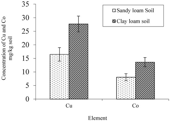Figure 1 shows that the mean concentration of available Cu in soil was 16.5 mg/kg in sandy loam and 27.7 mg/kg in clay loam. The concentration of bioavailable Co was 8.1 mg/kg soil in sandy loam and 13.6 mg/kg soil in clay loam soil. There was a significantly higher (