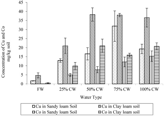 In sandy loam, the concentration of Co increased from 0.09 mg/kg soil with FW to 15.3 mg/kg when irrigated with 100% CW. In clay loam, the concentration of Co increased from 0.5 mg/kg soil with FW to 15.3 mg/kg when irrigated 50% CW. There were, however, no significant differences in Co concentrations in clay loam among the 50% CW, 75% CW, and 100% CW water treatments.