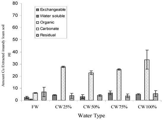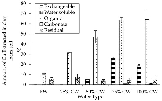 The amount of water-soluble Cu fractions recovered was 0.6 μg in control treatment but none detectable in all treatments where contaminated water was used. The carbonate Cu fraction was also non-detectable in all treatments except for the 100% CW, where the amount extracted was 0.26 μg.
