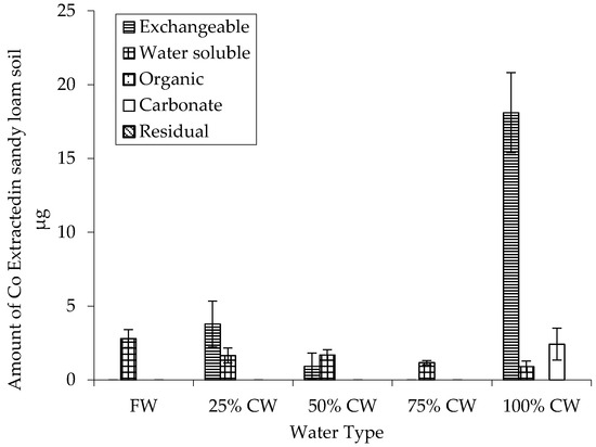 The carbonate fraction in sandy loam soil was only extracted where 100% CW was applied. There was no Co extracted from the organic and residual fractions in sandy loam soil.