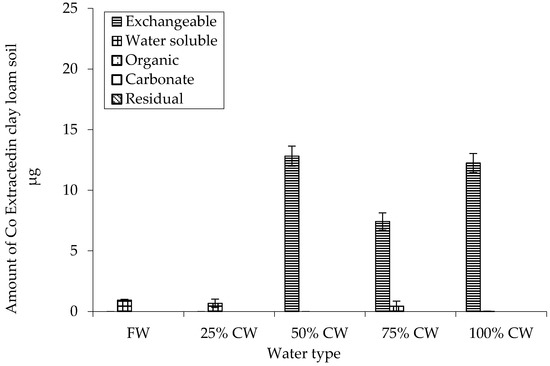 The water-soluble Co fraction in clay loam soil showed significant differences (p < 0.05; LSD0.05 = 0.95) among irrigation water treatments. There was an apparent significant decline in the extracted water-soluble Co fraction when contaminated water was used on the soil. The decline in the water-soluble fraction in clay loam soil ranged between 0.94, 0.68, and 0.01 µg/g in FW, 25% CW and 100% CW, respectively.