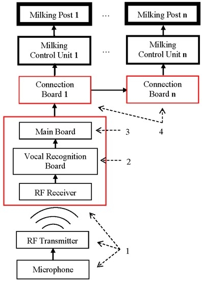 Hardware layout—connection scheme of the electronic components of the device. The device includes: (1) a microphone, a Radio Frequency (RF) transmitter, and receiver; (2) a vocal recognition board; (3) a main board; (4) a connection board for each milking post connected, made by Arduino UNO, and a specialized relay module. In red are shown the boxes where the electronic components of the device were placed in order to connect the system to the existing milking machine.