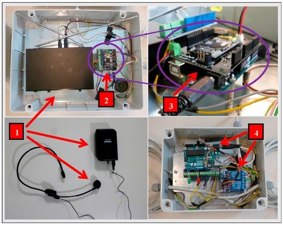 Details of the electronic components used for the tested device: (1) a microphone, transmitter, and receiver; (2) a vocal recognition board; (3) a main board; and (4) a connection board for each milking post connected, made by Arduino UNO, and a specialized relay module.