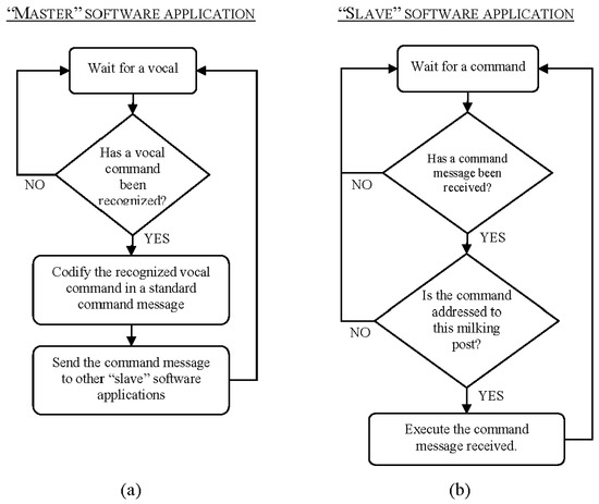 Two software applications were developed according to a master/slave design model using the programming language of Arduino and its Integrated Development Environment (IDE—Arduino 1.5.7, Arduino S.r.l., Scarmagno, Turin, Italy). After a compilation procedure was performed by the IDE, these software applications were used as firmware in the Arduino boards. The first application (the master) was uploaded on the main board, and the second application (the slave) was used as firmware in each connection board. A specific set-up was used in each connection board, which enabled the software application to store the number of the milking post to which the specific connection board was connected. Flow diagrams of these software applications are presented in Figure 3.