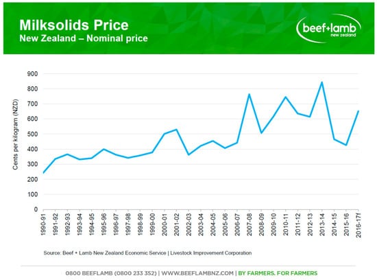 A 10-year movement in milksolids prices in New Zealand is shown [].