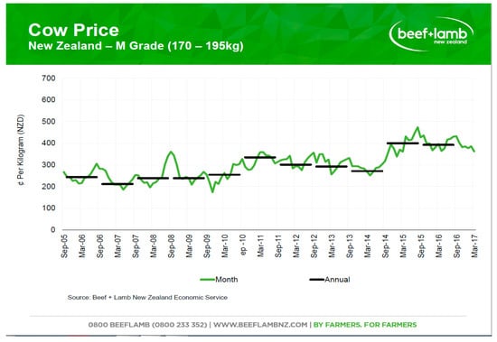 A 10-year movement in cow meat prices in New Zealand is shown [].