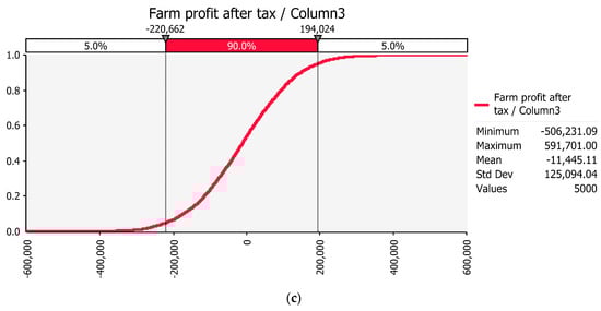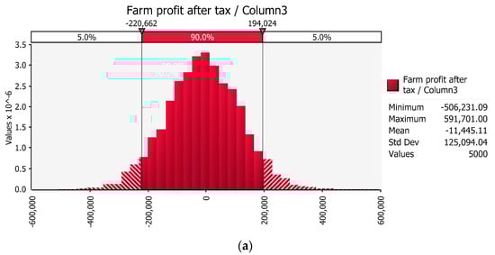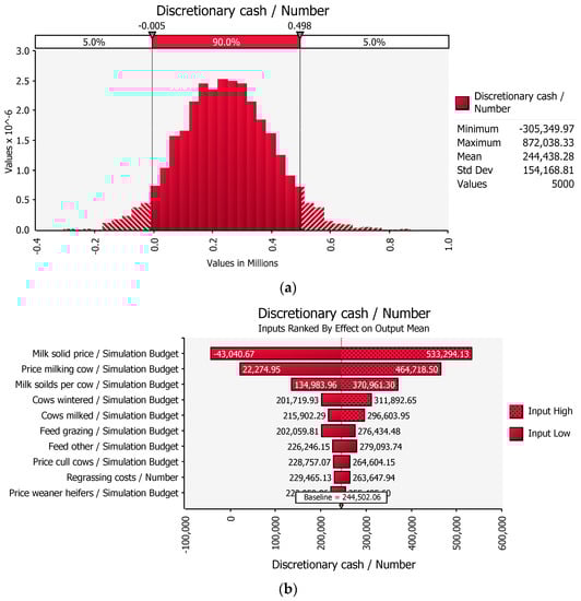 The analyst has a large selection of distributions which may be applied to inputs. A commodity may be at a record low price and an input for the commodity price may be chosen with a positive skew, as the analyst may expect the price to increase or vice versa. As each simulation takes a few seconds, any number of situations could be considered. For the examples demonstrated in this commentary, the current price for livestock was used with a “normal distribution”. A price of $6.00 per kg milk solids (kg MS−1) was used in the dairy farm, although the current price is $6.50, as this was the price used in [,]. The standard deviation for any distribution is defined by the user, and, for this exercise, they were set to reflect deviation in price movements over recent years.