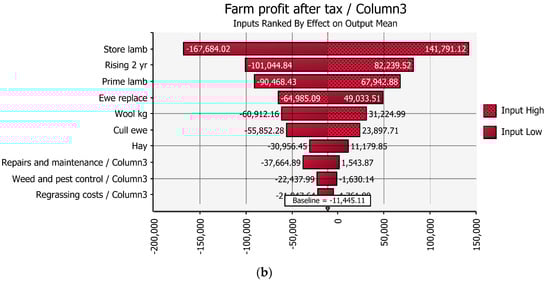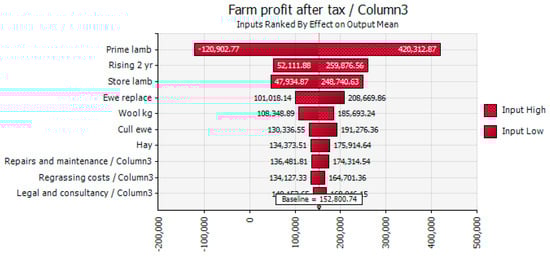 This example demonstrates the power of risk profiling and how it differs from standard variance analysis. The change contemplated with the parameters set leaves the farm with a baseline loss of $11,435 rather than a $7250 profit when 5000 Monte Carlo simulations are run. However, if by destocking the farm the percentage of prime lambs sold increases from 15% to 50% then the profitability changes. By improving the percentage of lambs finished the profitability changes to a baseline profit of $152,800 and the tornado graph shows the biggest impact on profitability is now prime lambs (see Figure 6). Although even in this scenario the standard deviation of after tax profit is $177,000, which is expected in New Zealand pastoral production systems [].