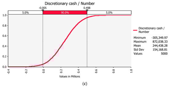 “@Risk” simulated risk profile for the dairy farm, showing distribution of discretionary cash (a); tornado chart (b); and cumulative distribution of discretionary cash (c).