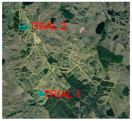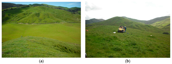 This research involved the collection of 200 samples from each of two trial sites: Trial 1 and Trial 2 (Figure 1), at “Patitapu” in the Wairarapa. The research site has annual applications of single superphosphate (0% N, 9% P, 0% K, 11% S, 20% Ca). The soil samples were collected the week before fertilizer was applied (i.e., one year after previous application). The sites were selected according to accessibility and slope. Trial 1 was located in a gently undulating paddock (Figure 2a). Sample cores were taken to a depth of greater than 15 cm. Trial 2 was located on a moderately-to-steeply-sloped paddock (Figure 2b). Cores were taken to a maximum depth of 15 cm due to difficulty in consistently coring deeper than this—especially on steeper, drier parts of the slope [8].