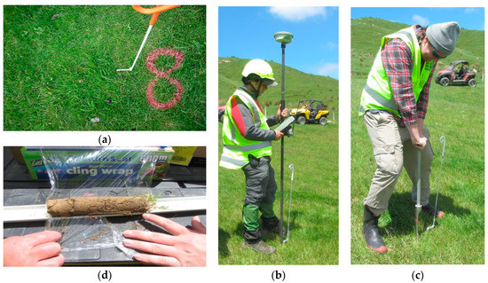 (a) Pigtail marker and core number; (b) Leica RTK GPS used to find grid sites; (c) Taking the 50 mm-diameter soil core; (d) Wrapping a core.