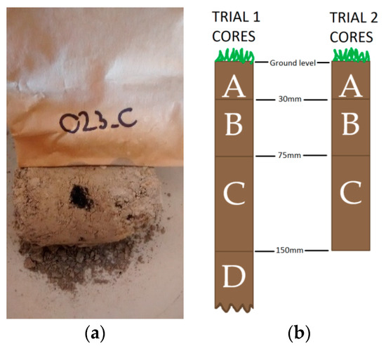 Trial 1 cores were cut into four sections according to depth: A—0–30 mm, B—30–75 mm, C—75–150 mm, and D—>150 mm; and Trial 2 cores were cut into three sections: A—0–30 mm, B—30–75 mm, C—75–150 mm (Figure 5a,b). Each sample was ground using a pestle and mortar and sieved through a 2-mm sieve. Once dried and ground, each sample was scanned again using the ASD. Trial 1 Section D was not analysed for this research project due to the lack of a comparative Trial 2 Section D, as the subsoil on site 2 prevented sampling to layer D.
