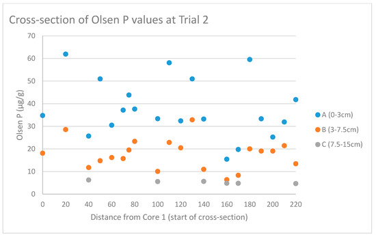 Figure 6 shows a cross-section of Trial 2 from cores 1 to 20. This covers a distance of 220 m, with Olsen P values measured for Section A, B, and C at 5, 10, or 20 m intervals. It is evident that plant available phosphorus in soil varies significantly and seemingly randomly across the paddock along this transect for sections A and B. B is less variable than Section A, whilst Section C is fairly uniform; however, only six out of the possible 20 samples had measured Olsen P values along this transect due to the financial constraints that did not allow for measurement of Olsen P values for all Section C samples.