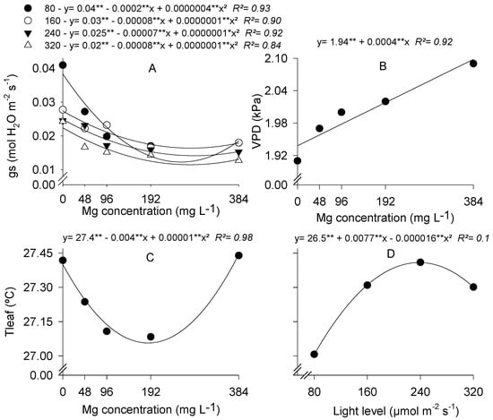 (A) Stomatal conductance (Gs; mol H2O m−2·s−1), (B) vapor pressure deficit (VPD; kPa), and (C,D) leaf temperature (Tleaf; °C) in coffee seedlings grown with different Mg concentrations and under different light levels. (*) Significant according to the t test at p < 0.05. (**) Significant according to the t test at p < 0.01.