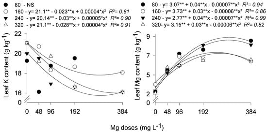 The reduction in leaf K contents as a function of the increase in Mg doses is due to the antagonistic effect among these nutrients. In general, increasing the amount absorbed from one cation can result in the reduction of the absorption of another cation [18]. This inhibition between these nutrients is competitive, that is, there is competition by the same site of the “carriers” in the membrane [19]. The antagonistic relationship between Mg and K was observed in experiments with several cultures [20,21,22].