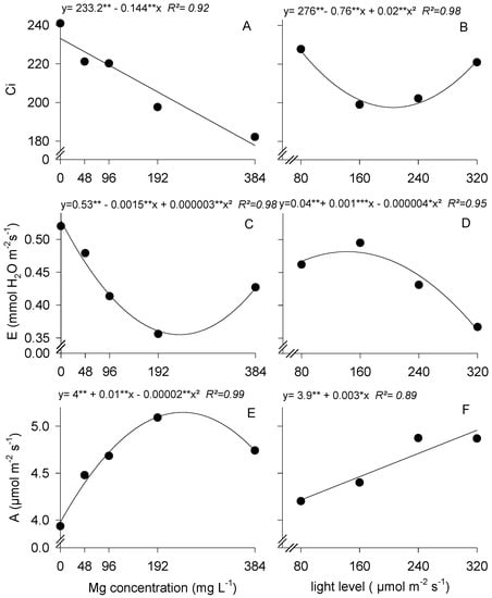 (A,B) CO2 internal concentration (Ci; µmol·mol−1), (C,D) transpiration (E; mmol H2O m−2·s−1), and (E,F) CO2 assimilation rate (photosynthesis, A; µmol·m−2·s−1) in coffee seedlings grown with different Mg concentrations and under different light levels. (*) Significant according to the t test at p < 0.05. (**) Significant according to the t test at p < 0.01.