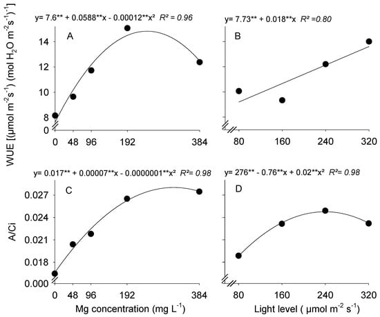 (A,B) Water use efficiency (WUE) and (C,D) instantaneous carboxylation efficiency (A/Ci) in coffee seedlings grown with different Mg concentrations and under different light levels. (*) Significant according to the t test at p < 0.05. (**) Significant according to the t test at p < 0.01.