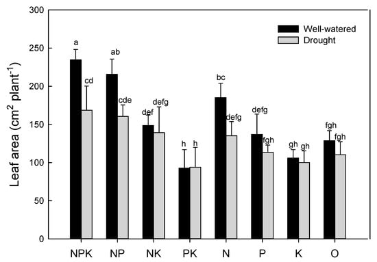Interactive effects of drought and the N, P and K nutrients applied individually or in combination, or with no nutrient application (0) on the leaf area of the maize seedlings at day 20 after sowing. The error bars represent the standard errors of the mean (n = 3) and fit within the plot symbol if not visible. Means accompanied by different letters are significantly different at p < 0.05.