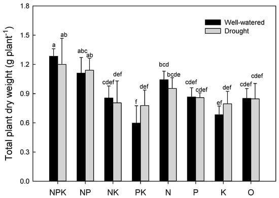 Interactive effects of drought and the N, P and K nutrients applied individually or in combination, or with no nutrient application (0) on the total dry weight (shoots + roots) of the maize seedlings at day 20 after sowing. The error bars represent the standard errors of the mean (n = 3) and fit within the plot symbol if not visible. Means accompanied by different letters are significantly different at p < 0.05.